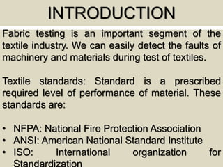 The document discusses various methods for testing textiles, including microscopic analysis and physical tests. Microscopic analysis is used to examine the structure of different fiber types such as cotton, wool, linen, silk, polyester, and nylon. Physical tests discussed include breaking strength, tearing strength, bursting strength, pilling propensity, air permeability, and abrasion resistance. Chemical testing methods like colorfastness properties and chemical solubility tests are also summarized.