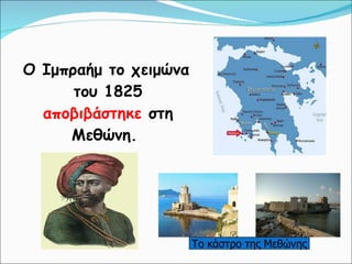 κεφ.26 ο ιμπραήμ στην πελοπόννησο και τη στερεά 1. Ο Ιμπραήμ στην Πελοπόννησο και τη Στερεά Ελλάδα. Κεφάλαιο 2 6 ο Η παρουσίαση διαμορφώθηκε από τον Πέτρο Σαμούχο. 2. Ο Ιμπραήμ το χειμώνα του 1825 αποβιβάστηκε στη Μεθώνη. Το κάστρο της Μεθώνης 3. Οι Έλληνες εξαιτίας του εμφυλίου δεν μπόρεσαν να τον εμποδίσουν , ενώ ο Κολοκοτρώνης και πολλοί οπλαρχηγοί ήταν φυλακισμένοι στην Ύδρα. Κολοκοτρώνης 4. Η ελληνική κυβέρνηση για να αντιμετωπίσει τον Ιμπραήμ διόρισε ως αρχηγό τον πλοίαρχο Σκούρτη , αν και η σύγκρουση θα γινόταν στη στεριά!!! 5. Ο στρατός του Σκούρτη διαλύθηκε στην πρώτη μάχη στο Κρεμμύδι και ο Ιμπραήμ κατέλαβε όλη τη Μεσσηνία, σπέρνοντας την καταστροφή στο πέρασμά του. 6. Ο λαός ζητούσε να απελευθερωθούν οι οπλαρχηγοί, για να αντιμετωπίσουν τον Ιμπραήμ και το στρατό του. 7. Ο Υπουργός Εσωτερικών Παπαφλέσσας , που είχε κι αυτός ευθύνη για τη φυλάκιση του Κολοκοτρώνη, ζήτησε να αφεθούν ελεύθεροι οι οπλαρχηγοί. Παπαφλέσσας 8. Ο Παπαφλέσσας με τους άνδρες του πήγε στη Μεσσηνία για να αντιμετωπίσει τον εχθρό. 9. Οχυρώθηκε στο Μανιάκι και στη μάχη που ακολούθησε έπεσαν όλοι πολεμώντας ηρωικά. Μανιάκι 10. 11. 12. 13. Ο Δ. Υψηλάντης και ο Μακρυγιάννης αντιμετώπισαν τον Ιμπραήμ με επιτυχία στους Μύλους του Άργους και τον ανάγκασαν να επιστρέψει στην Τριπολιτσά. Δημήτριος Υψηλάντης Μακρυγιάννης 14. Ο Κολοκοτρώνης κατάλαβε ότι δεν μπορούσε να αντιμετωπίσει τον στρατό του Ιμπραήμ σε μια μεγάλη μάχη και εφάρμοσε την τακτική του κλεφτοπόλεμου . 15. Χάρη σε αυτή την τακτική ο Γέρος του Μοριά κατάφερνε να προξενεί φθορές στους Αιγυπτίους και ταυτόχρονα να κρατάει την Πελοπόννησο επαναστατημένη . 16. Παράλληλα η ελληνική κυβέρνηση ανέθεσε στο Γάλλο συνταγματάρχη Φαβιέρο να οργανώσει τακτικό στρατό . Κάρολος Φαβιέρος 17. Τον ίδιο καιρό ο Κιουταχής πολιορκούσε το Μεσολόγγι με 20.000 άνδρες. Κιουταχής 18. Η πολιορκία κράτησε έναν περίπου χρόνο και οι Έλληνες αντιμετώπισαν νικηφόρα τις επιθέσεις των Τούρκων. Ο Μιαούλης κατάφερνε να σπάει το ναυτικό αποκλεισμό και να εφοδιάζει την πόλη με τα απαραίτητα. 19. Οι πολιορκημένοι, αφού συνεννοήθηκαν με τον Καραϊσκάκη και τους άλλους οπλαρχηγούς της Στερεάς, επιτέθηκαν ταυτόχρονα στο στρατό του Κιουταχή αναγκάζοντάς τον να αποσυρθεί. Γεώργιος Καραϊσκάκης 20. Ο Ιμπραήμ βλέποντας ότι ο Κιουταχής καθυστερεί με την πολιορκία του Μεσολογγίου πέρασε στη Ρούμελη για να τον βοηθήσει. 21. 22. 23.