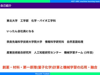 The document discusses the work of the AIST AIRC Machine Learning Team, led by Masashi Tsubaki, in applying graph neural networks (GNNs) for molecular property prediction and related tasks. It includes details about various datasets, training parameters, and GitHub resources associated with their projects, emphasizing advancements in machine learning techniques for chemistry. The team showcases models like MolecularGNN and SchNet, highlighting performance metrics and applications in chemical research.