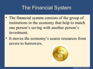 The financial system consists of institutions that match savers and investors. It includes financial markets like the stock and bond markets, where savers can directly provide funds to borrowers, as well as financial intermediaries like banks and mutual funds, where savers can indirectly provide funds. Government policies around taxes, spending, and deficits can impact saving, investment, and interest rates in the market for loanable funds by shifting the supply of or demand for funds.
