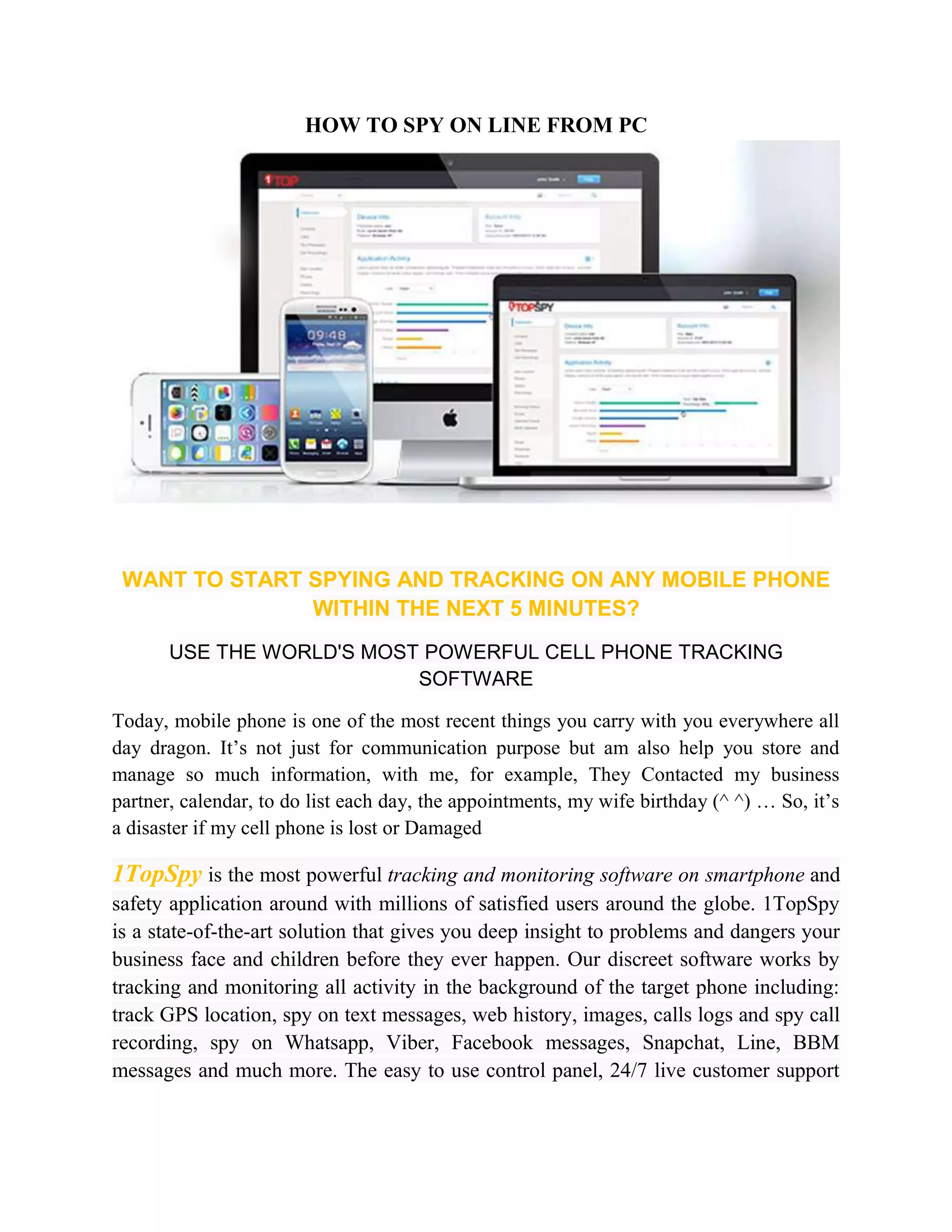 This document describes a cell phone tracking software called 1TopSpy that allows users to spy on phones remotely. It claims 1TopSpy can track location, read texts, calls, social media messages, and browse history. The summary describes how to install 1TopSpy by downloading it on the target phone, logging into an online account, and accessing the phone's data from any device. Customer testimonials praise 1TopSpy for allowing parents to monitor children and employers to oversee workers.