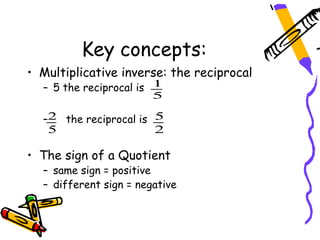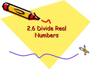 The document provides examples and explanations for dividing real numbers, including finding multiplicative inverses, determining the sign of quotients based on the signs of the numbers, and calculating the mean of a data set. It demonstrates how to simplify expressions by dividing both the numerator and denominator by the same value. The examples guide the reader through dividing positive and negative numbers, as well as calculating the mean minimum daily temperature over a five day period.