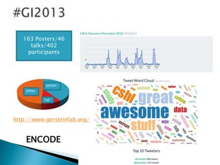 This document summarizes information from several genomics and bioinformatics research groups and projects. It discusses:
