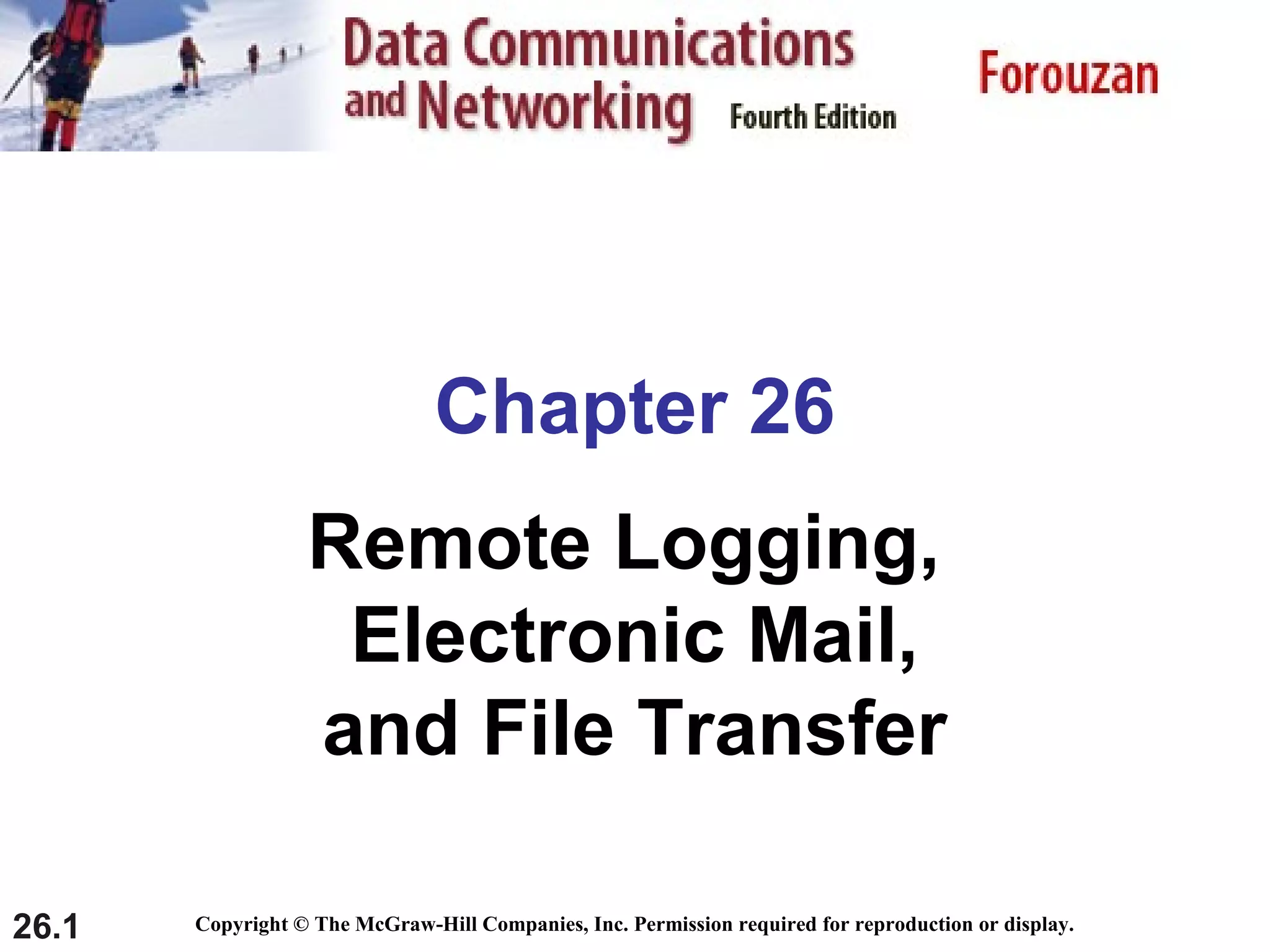 The document discusses remote logging, electronic mail, and file transfer protocols. It describes TELNET, a general-purpose client/server program that allows users to access applications on remote computers. It then covers electronic mail (e-mail), including its architecture, components like user agents, message transfer agents, and message access agents. Finally, it discusses file transfer protocols like FTP, how they use TCP connections, and provides examples of FTP sessions.