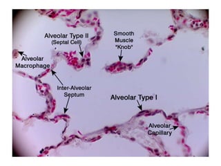 The respiratory system maintains normal levels of oxygen, carbon dioxide, and pH in the blood. Air enters the nose and travels through branching airways until reaching the alveoli in the lungs where gas exchange occurs. The lungs are kept inflated by the negative pressure between the visceral and parietal pleura, and contraction of the diaphragm and intercostal muscles during inhalation increases the thoracic cavity volume. Exhalation is a passive process as elastic forces cause lung deflation when the muscles relax.