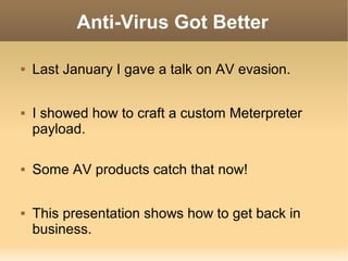 This document summarizes a presentation on evading antivirus detection. It discusses how antivirus has gotten better at detecting old techniques, and introduces newer tools and methods for generating payloads that can bypass antivirus software, including Veil, Hyperion, and writing your own custom stagers and payloads. It also recommends building your own antivirus lab to reliably test new payloads before deployment.