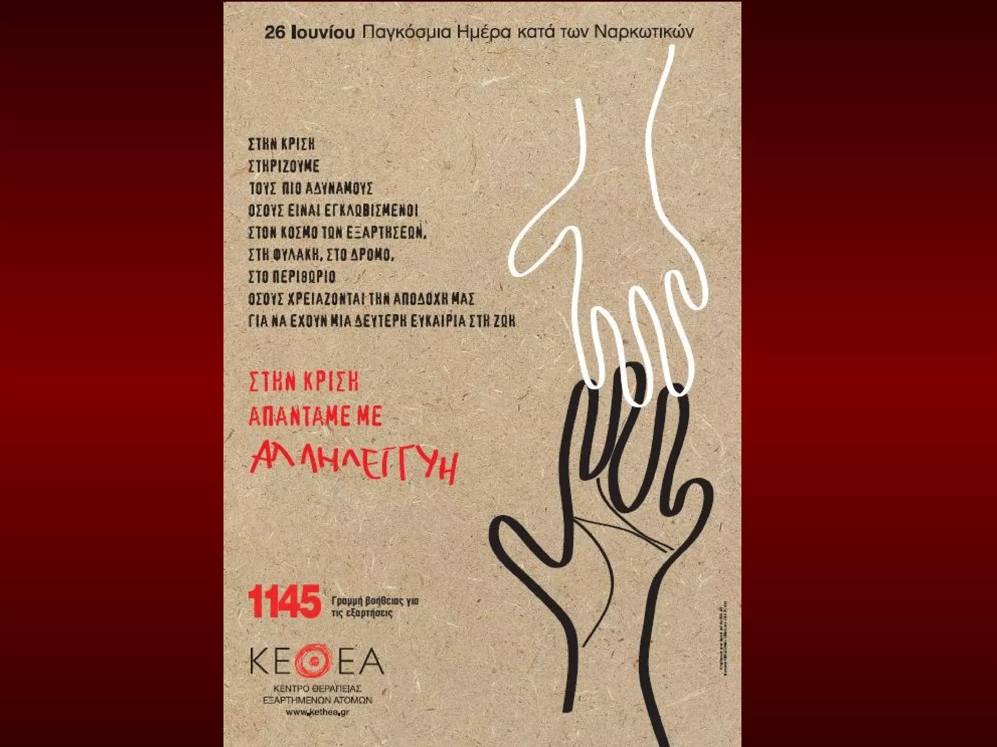 Το κοινωνικό κόστοςτης εξάρτησης Αυξημένη χρήση υπηρεσιών υγείας Αύξηση του κόστους δίωξης και απονομής δικαιοσύνης Αυξημένη ενδοοικογενειακή βία Αυξημένη παραμέληση φροντίδα παιδιών Μειωμένη παραγωγικότητα Αυξημένη χρήση κοινωνικών υπηρεσιών Αυξημένη κοινωνική όχληση Αυξημένοι κίνδυνοι μετάδοσης λοιμωδών νοσημάτων Αυξημένοι κίνδυνοι εξάπλωσης της χρήσης ουσών Αυξημένα ποσοστά πρόωρης διακοπής του σχολείου (CIBHP 2009, NSUDH 2004, ΚΕΘΕΑ 2010, ΕΚΤΕΠΝ 2010 )