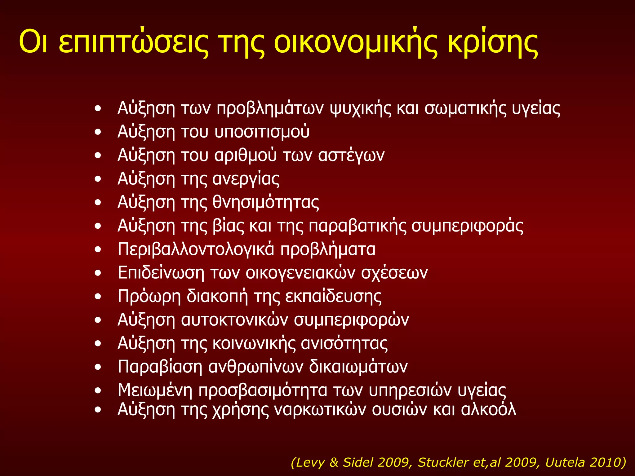 Οι επιπτώσεις τηςοικονομικής κρίσης Αύξηση των προβλημάτων ψυχικής και σωματικής υγείας Αύξηση του υποσιτισμού Αύξηση του αριθμού των αστέγων Αύξηση της ανεργίας Αύξηση της θνησιμότητας Αύξηση της βίας και της παραβατικής συμπεριφοράς Περιβαλλοντολογικά προβλήματα Επιδείνωση των οικογενειακών σχέσεων Πρόωρη διακοπή της εκπαίδευσης Αύξηση αυτοκτονικών συμπεριφορών Αύξηση της κοινωνικής ανισότητας Παραβίαση ανθρωπίνων δικαιωμάτων Μειωμένη προσβασιμότητα των υπηρεσιών υγείας Αύξηση της χρήσης ναρκωτικών ουσιών και αλκοόλ (Levy & Sidel 2009, Stuckler et,al 2009, Uutela 2010)