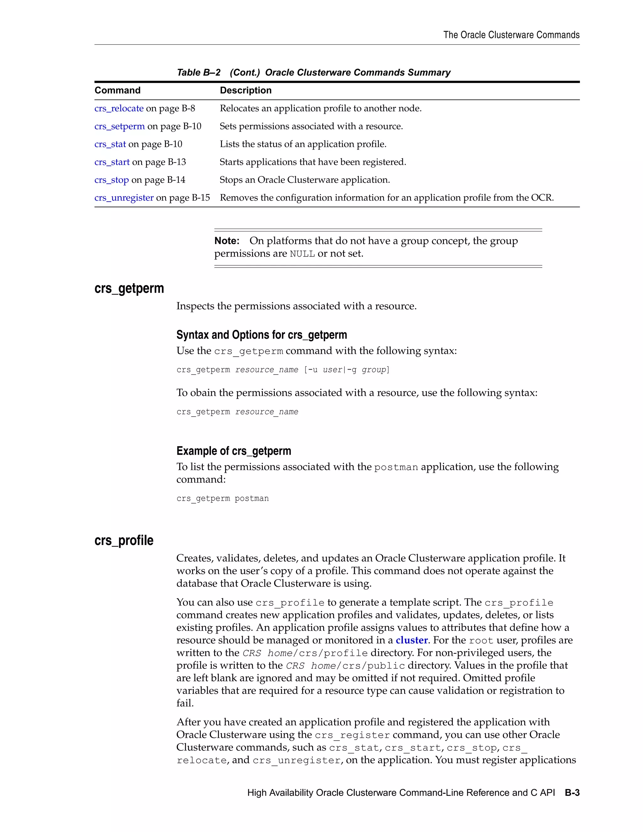 The document describes several Oracle Clusterware commands used to manage application profiles and register, relocate, start, and stop applications in an Oracle Clusterware environment. Some key commands covered include crs_profile for creating and managing application profiles, crs_register for registering applications with Oracle Clusterware, and crs_relocate for moving registered applications between nodes. The document provides syntax, examples, and descriptions for using these commands.