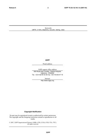This document provides specifications for testing the acoustic performance of speech and video telephony terminals. It describes test setups for different types of terminals including handset, headset, and hands-free terminals. It also outlines test methods for measuring characteristics like overall loss, idle channel noise, frequency response, sidetone performance, and stability against changing environmental conditions. The document was developed by the 3rd Generation Partnership Project for future development work within the project only.