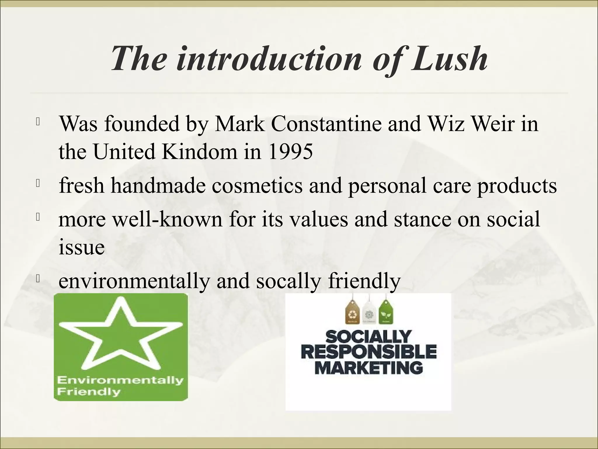 The introduction discusses Lush, a cosmetics company founded in the UK in 1995 that is known for its fresh, handmade products and social activism. It promotes environmental and social causes. Lush appeals to consumers interested in these issues and who see the brand as representing their ideal selves. Advertising for Lush could highlight its stances on issues to attract consumer innovators open to new ideas and who want to support such causes through their purchasing choices.