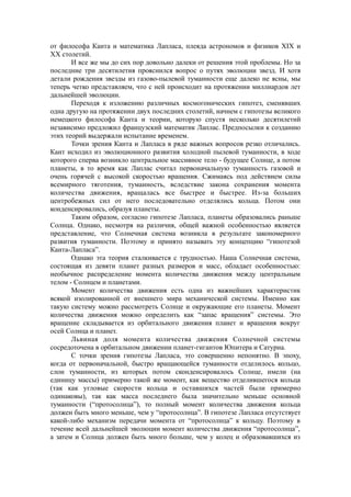 Реферат по астрономии разбирает проблемы происхождения Солнечной системы, изучая теории таких ученых, как Кант, Лаплас и Джинс. Кант и Лаплас предлагали гипотезу о закономерном образовании планет из первичной туманности, тогда как гипотеза Джинса утверждала, что образование планетарных систем является случайным и следствием взаимодействия с другими звездами. Последующие теории, в том числе предложение О.Ю.Шмидта, связывают образование планет с захватом вещества из газа, что решает проблемы, связанные с моментом количества движения в системе.