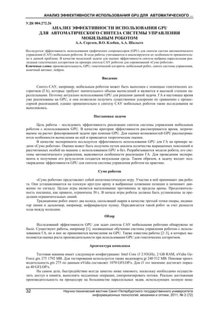 Документ исследует эффективность использования графических сопроцессоров (GPU) для автоматического синтеза систем управления мобильным роботом, анализируя производительность генетических алгоритмов при решении задачи 'сумо роботов'. Работы показывают, что применение GPU позволяет существенно увеличить скорость выполнения вычислений по сравнению с традиционными процессорами, с ожидаемым ускорением порядка 20 раз. В качестве эксперимента разработана визуальная среда, которая позволяет оценивать эффективность синтеза и результаты работы алгоритмов.