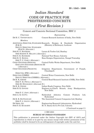 This document is the Indian Standard Code of Practice for Prestressed Concrete (First Revision). It provides guidelines for the structural use of prestressed concrete, covering both on-site work and precast prestressed concrete units. The code contains four sections dealing with general provisions, materials/workmanship/testing, general design requirements, and structural design using the limit state method. It incorporates changes from the previous version to unify prestressed and reinforced concrete provisions and introduce limit state design concepts.