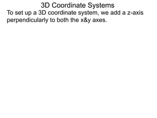 The document discusses 3D coordinate systems. It explains that a 3D coordinate system adds a z-axis perpendicular to the x- and y-axes. There are two ways to orient the z-axis, resulting in right-hand and left-hand systems. Points in 3D space are identified by ordered triples (x,y,z). Graphs of equations in 3D are surfaces. Constant equations like x=k form planes parallel to coordinate planes.