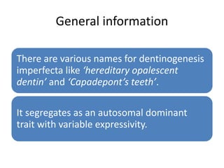 Dentinogenesis imperfecta is a hereditary condition that affects the dentin and manifests in several subtypes. Shield type I is associated with osteogenesis imperfecta and causes fragile bones and blue sclera. Teeth appear blue, brown, or yellowish-brown. Shield type II is a more severe form of Shield type I but is not associated with osteogenesis imperfecta. Shield type III causes thin enamel and dentin, opalescent and bell-shaped teeth, and multiple pulp exposures. Radiographs show tooth attrition, constricted cervical portions, obliterated pulp chambers, and periapical radiolucencies without pulpal involvement. Diagnosis is based on rapid enamel loss and attrition
