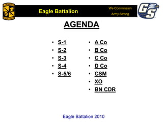 The document provides details of the Eagle Battalion staff call agenda and activities for multiple dates in October and November 2010. It includes status updates from various sections (S-1 through S-4), weather forecasts, training schedules, and specifics of planned labs and field training exercises involving squad attacks, key leader engagements, and land navigation. The trainings are intended to ensure cadets are on track academically while improving skills at the squad level.