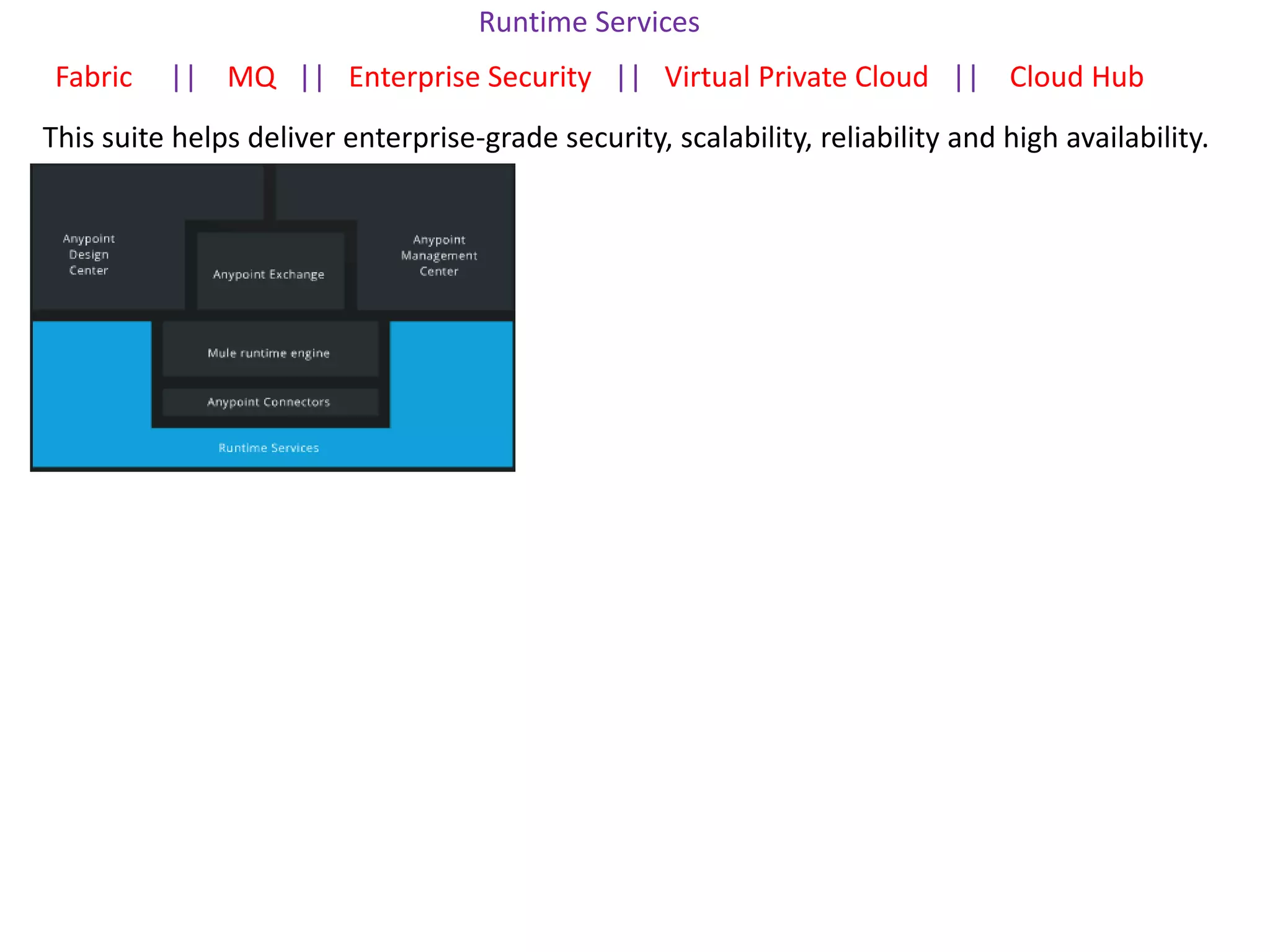 This suite helps deliver enterprise-grade security, scalability, reliability and high availability through Runtime Services including Fabric, MQ, Enterprise Security, Virtual Private Cloud, and CloudHub. Fabric enables 100% uptime, high transaction throughput, and scalability. MQ provides asynchronous messaging with managed cloud message queues. Enterprise Security provides capabilities to secure API-led connections. Virtual Private Cloud allows secure connectivity between cloud and on-premises assets. CloudHub is a fully-managed cloud platform for integration and APIs.