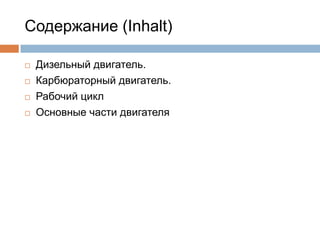 Документ содержит информацию о карбюраторных и дизельных двигателях внутреннего сгорания, их принципах работы и основных компонентах. В нем описаны особенности работы дизельных двигателей, а также процесс карбюрации в карбюраторных двигателях. Также упомянуты ключевые элементы конструкции двигателей, такие как поршень, шатун и коленчатый вал.