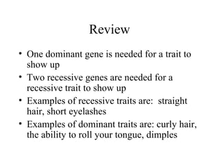 Human traits can be inherited in different ways. Dominant traits will show up if there is one dominant gene, while recessive traits require two recessive genes. Examples of incomplete dominance are pink snapdragons and people with both round and sickle-shaped blood cells. Sickle-cell anemia results when someone inherits two genes for sickle-shaped blood cells. Blood types are determined by the A, B, and O genes. Colorblindness is inherited through the X chromosome.
