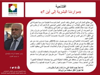 اٌجؾش٠خ ِٛاسدٔب» يخيٌّإعغ َيبياٌؼ يذ٠شيٌّا يايٚل ٌٟيبياٌؾ ٟيياٌذساع َيبياٌؼ يغيٍِي ٟييفيخيّ١ّ١ٍرؼي١خيِذسعيخيّ٠ٛٔخجٟييف ٌٟأل٘ب ٌ١مٛي ٌْجٕباٌيالة:ْئٟفي ْٛ٠ىي ْأ دثيذ ُألٚدد٘ي ٟاٌغيبِؼ ٍّٟاٌؼ اٌيٍت ًِغزمج ؽ١ش ،أِ١شوبٕ٘بنَاؾُىزرُٙىبلبرٚ٠ٍٕٙٛاٞاٌز ٍُاٌؼ ُِّٓٗٔٛ٠غزؾم!!! ِٓٚايبص ثزيشٚي ِٓ اٌّبد٠خ اٌّٛاسد ؽٛي اٌؼبٌّ١خ ٜٛاٌم ٓ١ث َِؾزذ اٌقشاع ْأ اٌّؼشٚف ِْٚؼبد.رضاي ٚدِٓ ٟٔرؼب اإلعالِ١خ ثالدٔبرٌه.ّدئرٍيٛػ ثيذأد عذ٠ذح ِؼشوخ ْأ ٚ٠جذ ٗٔأ ٟفٟ٘ٚ أد ،األفكاٌّٛاسد ٍٝػ اٌقشاعٚثيبألصـ ،اٌؾيجبة ابصقٛفي ،اٌجؾيش٠خأفيؾبة اٌزفٛقُِٕٙ. رؾ١شَػيب ًؽقي ُِٙي مسؽيذ ٝئٌي اٌؼبٌّ١خ اإلؽقبءاد2015َ,ُ٘ي َٓيِ ػيذد ٜٚرغيب ؽ١يش فٛق65ِٓ ًأل ُ٘ َِٓ ِغ عٕخ5عٕٛاد.اٌذساعبد ٚرزٛلغاااصد٠بدٚٔمـ ،ٌٍىجبس ااِيشد اٌمبدِيخ يٛدياٌؼم ٟفي بس ييٌٍق ِييشد(يججٙبيعيخي٠اٌشػبٚاٌؼالعيبديتياٌي يبيٙ٠ؾمم ٟاٌزي يؾ١خياٌق ،ٌٍىجبسِٓ اإللالي ؽ١ٛع ًِمبثاإلٔغبة.) ،ٕ٘يب ِٓياٌيذٚي ثيذأد"اٌّزمذِيخ"–اٌؾي١خٛصخ ٛٔؾي اٌّزغٙيخٌٍؾيجبة ٚاٌّفزميذح-ٗثبٌزٛعي يذٚييٌا ٓييِ يجبث١خياٌؾ يبدياٌيبل يزاةيدعز"يخي١ِإٌب!“ٓييػُ٘يذيٕػ يخيثبٌذساع ُٙيشابيئا يكي٠ىش ٌٟٚثبٌزب ،ُٙ٠ٌذ ًّٚاٌؼصذِخِغزّؼبرٙب. ١١ش؟ ٌٍز اٌّزؼيؾخ ِغزّؼبرٕب ثٙب ٌٟٕٕج ِّلخٛاٌّزف ىبلبرٕب ٍٝػ ٔؾبفظ ْأ ٓٔؾ ثٕب ُّٞاٌؾش أٌ١ظ لبيٌُٟ٘أؽذ:ِٚبراُدػٙي ؟ ػٕيذٔب ْٚع١غذ٠يز٘جٛا...ٓٔؾئؼيشف دٚد ،ُٙل١ّيزٔغيزي١غ ُ٘اعزضّبس. إوهانخي ألمخىا جذيذ ٍّححذزانج مابانثرواث ًةزاخر... فالثرواحىا مه ًةاسخفاد األقم َّوكىوه.