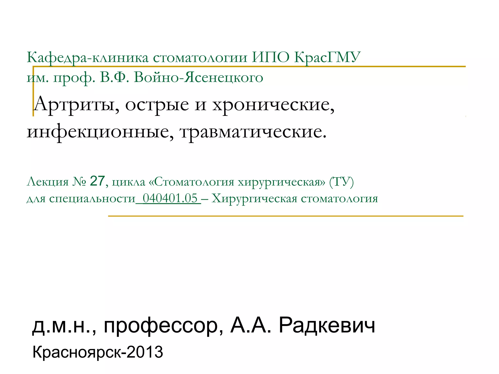 Лекция посвящена клинике, диагностике и лечению височно-нижнечелюстных артритов, которые являются сложной областью хирургической стоматологии. В структуре лекции рассматриваются основные понятия, классификация заболеваний и лечебные мероприятия. Также представлена литература и электронные ресурсы для дальнейшего изучения темы.