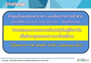 ้ตามความเหมาะสม ชื่อโครงการ : THE SMART CHEF Challenge 2015 “ค้นหาสุดยอดเชฟอาหารไทยสี่ภาค” ระยะเวลาดาเนินการ : 16 พ.ค. - 15 ก.ค. 58 หมายเหตุ : เนื้อหาที่นาเสนอนี้ อาจมีการปรับเปลี่ยนตามความเหมาะสม Campaign Activities ประเภทการประกวด : แบ่งเป็น 4 ประเภท 1 การประกวดอาหารไทยภาคเหนือ 2 การประกวดอาหารไทยภาคอีสาน 3 การประกวดอาหารไทยภาคใต้ 4 การประกวดอาหารไทยภาคกลาง