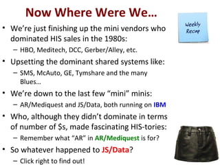 This document summarizes the history of the healthcare IT company JS/Data. It discusses how JS/Data was acquired by Baxter in 1984 along with another company, DCC, to expand Baxter's healthcare IT offerings. It then describes how Baxter and IBM partnered to form IBAX in 1989, and how IBAX was later acquired by HBOC in 1994, integrating JS/Data's products into HBOC's existing offerings. The document also provides brief biographies of some of the key people involved with JS/Data, including its founder John Sacco, and notes that Sacco now works at UCLA.