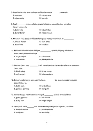 Dokumen ini berisi soal-soal latihan mengenai penggunaan kata ganda dalam bahasa Melayu. Setiap soal memberikan pilihan untuk mengisi tempat kosong dengan pilihan kata yang tepat. Fokus utama adalah pada teknik penggandaan dalam bahasa Melayu yang meliputi penggandaan penuh, separa, berentak, dan berimbuhan.
