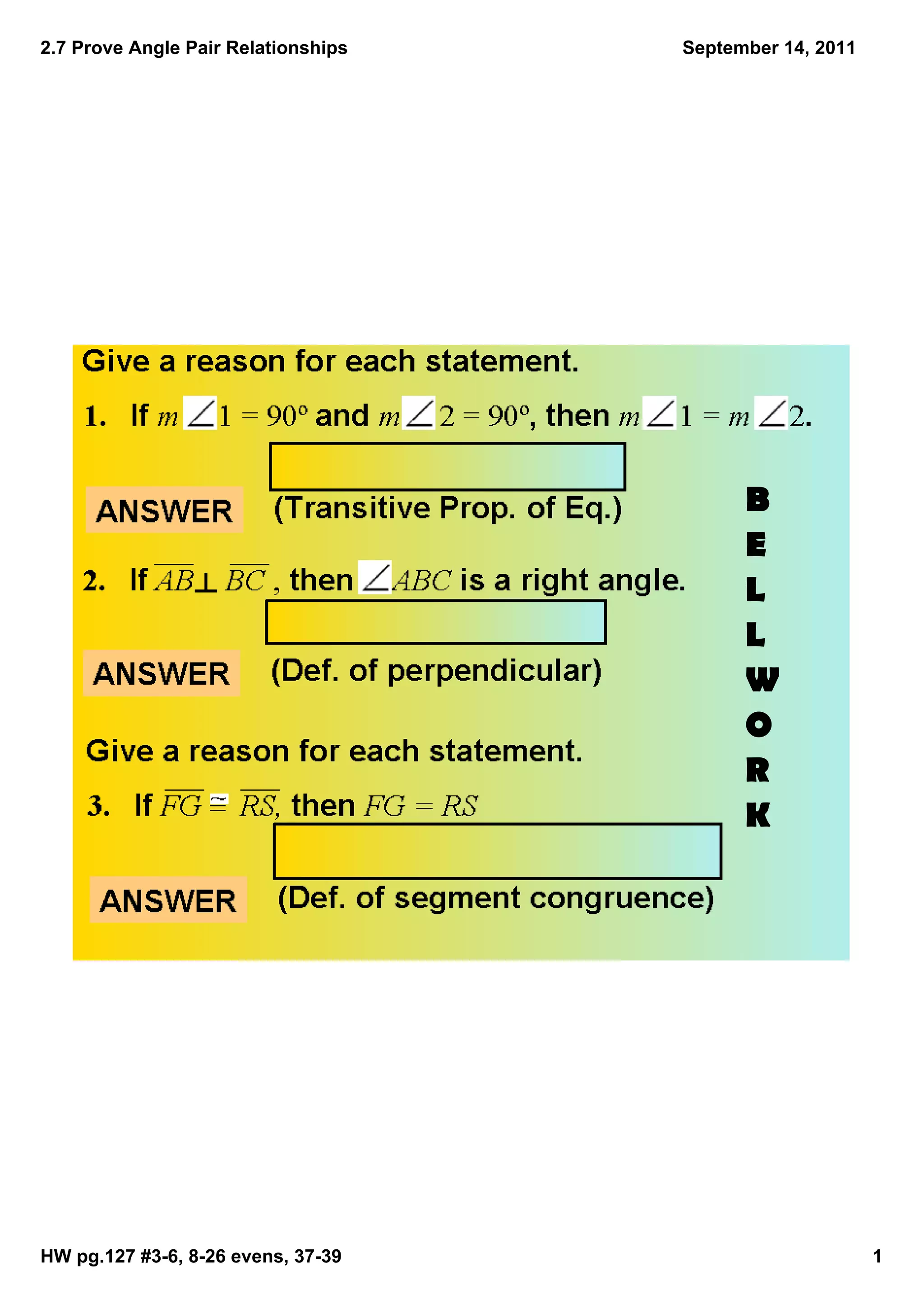 This document discusses several theorems about angle relationships: the Right Angle Congruence Theorem which states that all right angles are congruent; the Congruent Supplements Theorem which states that if two angles are supplementary to the same angle then they are congruent; the Congruent Complements Theorem which states that if two angles are complementary to the same angle then they are congruent; the Linear Pair Postulate which states that if two angles form a linear pair then they are supplementary; and the Vertical Angles Congruence Theorem which states that vertical angles are congruent. It provides proofs for some of these theorems and examples of how to draw diagrams and write statements to prove the Congruent Complements Theorem. Home