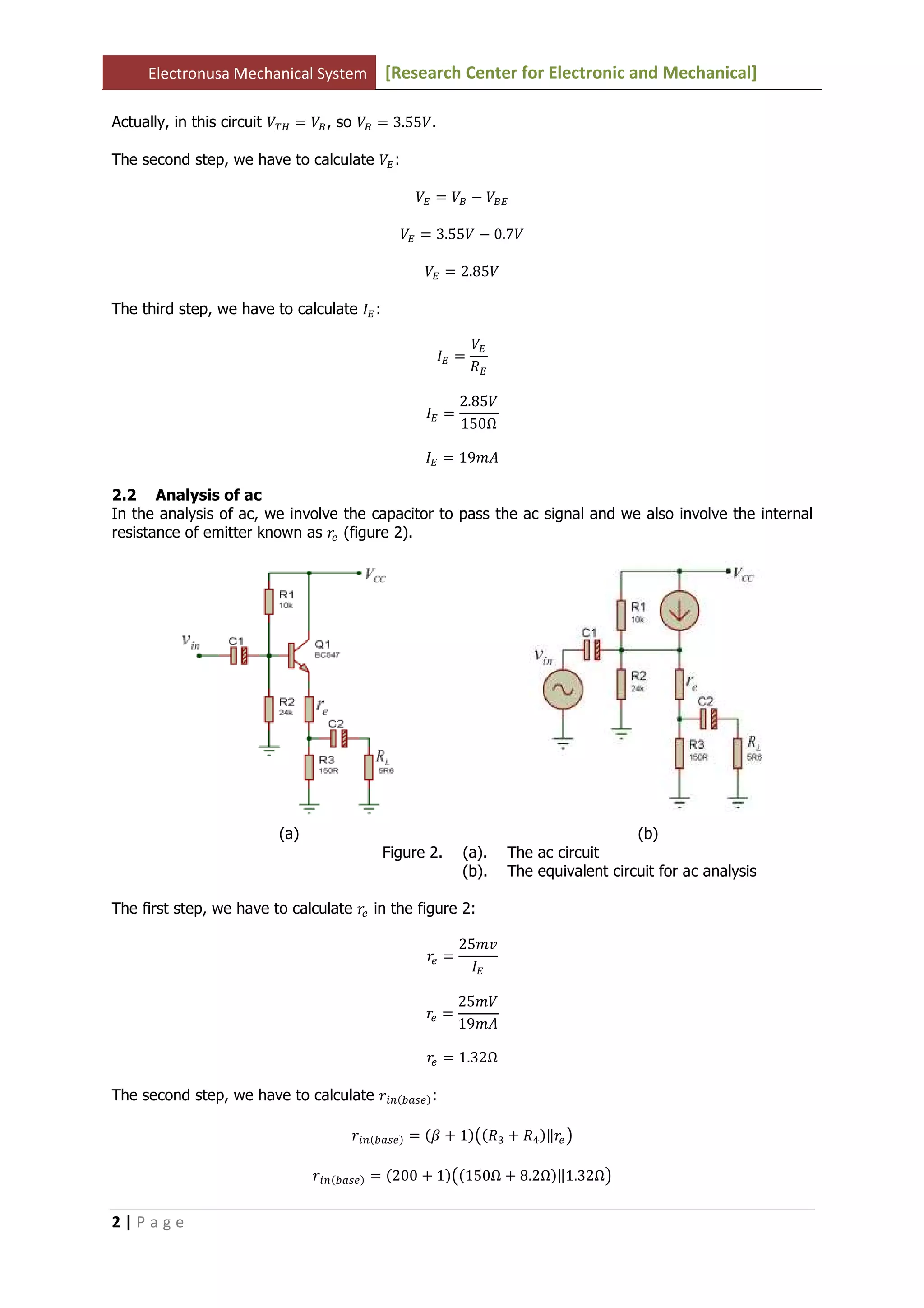 This document discusses impedance matching in audio signal processing. It presents an analytical analysis and simulation of a circuit that uses an emitter-follower configuration to provide impedance matching between an input and output. The analytical work derives expressions for various circuit parameters in both DC and AC analysis. The simulation results show good agreement with the analytical work but with some differences, likely due to approximations made in the analytical derivations. Percent differences between the analytical and simulation results are provided.
