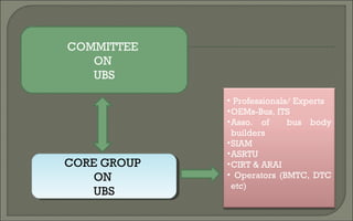 This document discusses recommendations for standardizing urban bus specifications in India. It proposes the following: