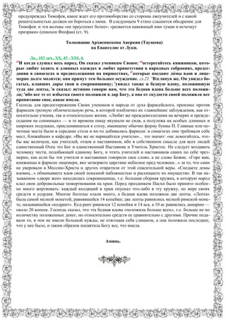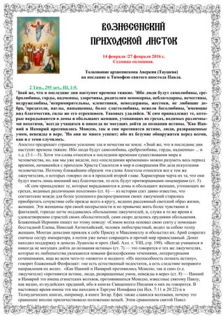 В вознесенском приходском листке содержится толкование архиепископа Аверкия на послание к Тимофею, в котором предсказывается, что в последние времена на Земле увеличится зло и лицемерие, особенно среди лжеучителей, которые будут обольщать женщин. Также исследуются слова Христа о фарисеях и вдове, подчеркнув важность искренности в жертвах перед Богом, где вдова, пожертвовавшая две лепты, оценивается выше богатых, которые жертвовали от избытка. Этот текст предостерегает верующих от лицемерия и обманов, подчеркивая призыв к искренности в вере и действиях.