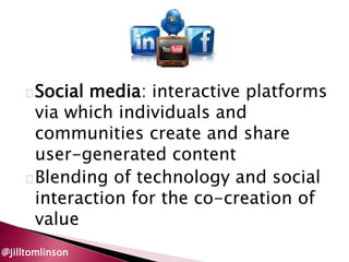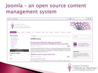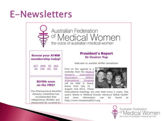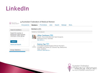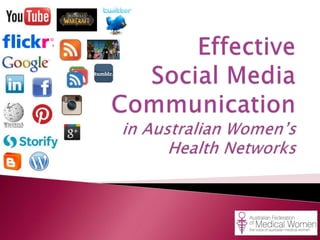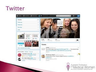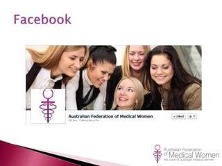 The document discusses social media and its use by the Australian Federation of Medical Women organization. It provides statistics on social media usage in Australia, such as Facebook having over 9 million users who spend almost 9 hours per month on the site. It also discusses how the organization has used social media platforms like Facebook, Twitter, LinkedIn and their website since 2008, tailoring each platform to its communication attributes and intended audience.
