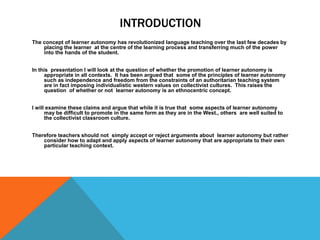 This document discusses whether the concept of learner autonomy is appropriate in collectivist societies. It argues that while some individualistic aspects of learner autonomy like independence may conflict with collectivist values, other aspects like group work can actually facilitate autonomy. Teachers should consider how to adapt, not reject, autonomy to their specific cultural contexts. Learner autonomy aims to prepare students to continue learning outside the classroom, which benefits all students, so teachers should select appropriate methods without simply accepting or rejecting autonomy as a whole.