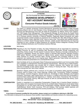 This document describes a sales position for a globally recognized contract manufacturer. The company generates $100 million annually and offers supply chain management and outsourced manufacturing services. Responsibilities include maintaining and growing accounts through networking and prospecting. The ideal candidate will have 3-5 years of consultative sales experience in consumer products and promotional goods. This is an immediate opening offering a base salary plus uncapped commissions for a potential six-figure compensation package.