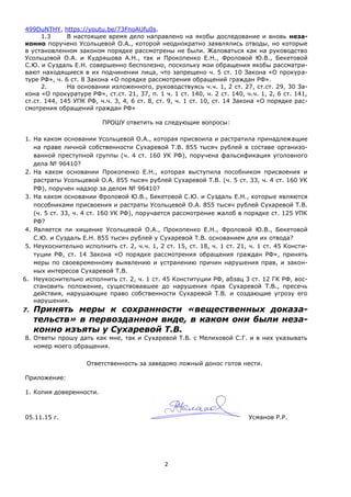 Документ является жалобой от защитника сухаревой Т.В. на незаконные действия следователей и прокуроров в уголовном деле No 96410, где утверждается, что их действия привели к фальсификации дела и хищению 855,000 рублей у подзащитной. Автор жалобы указывает на коррупционные преступления с участием различных должностных лиц и требует адекватного расследования и восстановления прав сухаревой. В частности, подняты вопросы о нарушении закона при возбуждении дела и неподаче необходимых отводов в рамках назначенного следствия.
