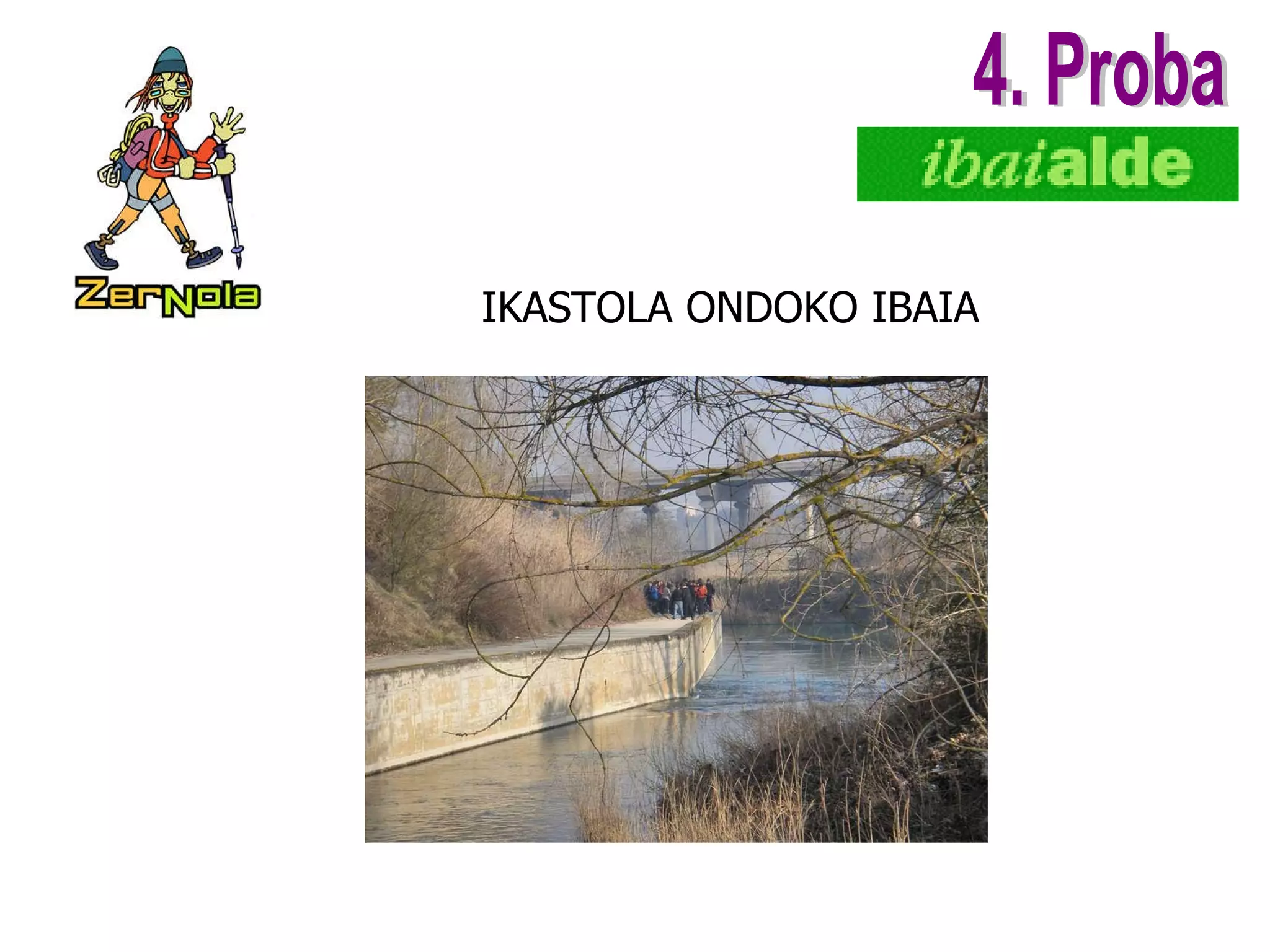 1. IBAIAREN DESKRIBAPENA4. Proba Aztertu dugun ibaiak Elortz du izena. Taxoare mendikatean jaiotzen da, Noain eta Ezkirotzetik pasatzen da eta gure ikastola ondotik ere bai. Ondoren Arga ibaiari elkartzen zaio, eta Mediterraneoan itsasoratzen da. Ibai honek bere ibilbidean nekazaritzako lurrak pasatzen ditu gehien, baina Noain eta Ezkirotzeko industria guneak ere bai. Honek guztiak eragina du ibaiaren egoeran Ibaian, presa txiki bat dago eta aspaldiko errota baten aztarnak ere badaude.