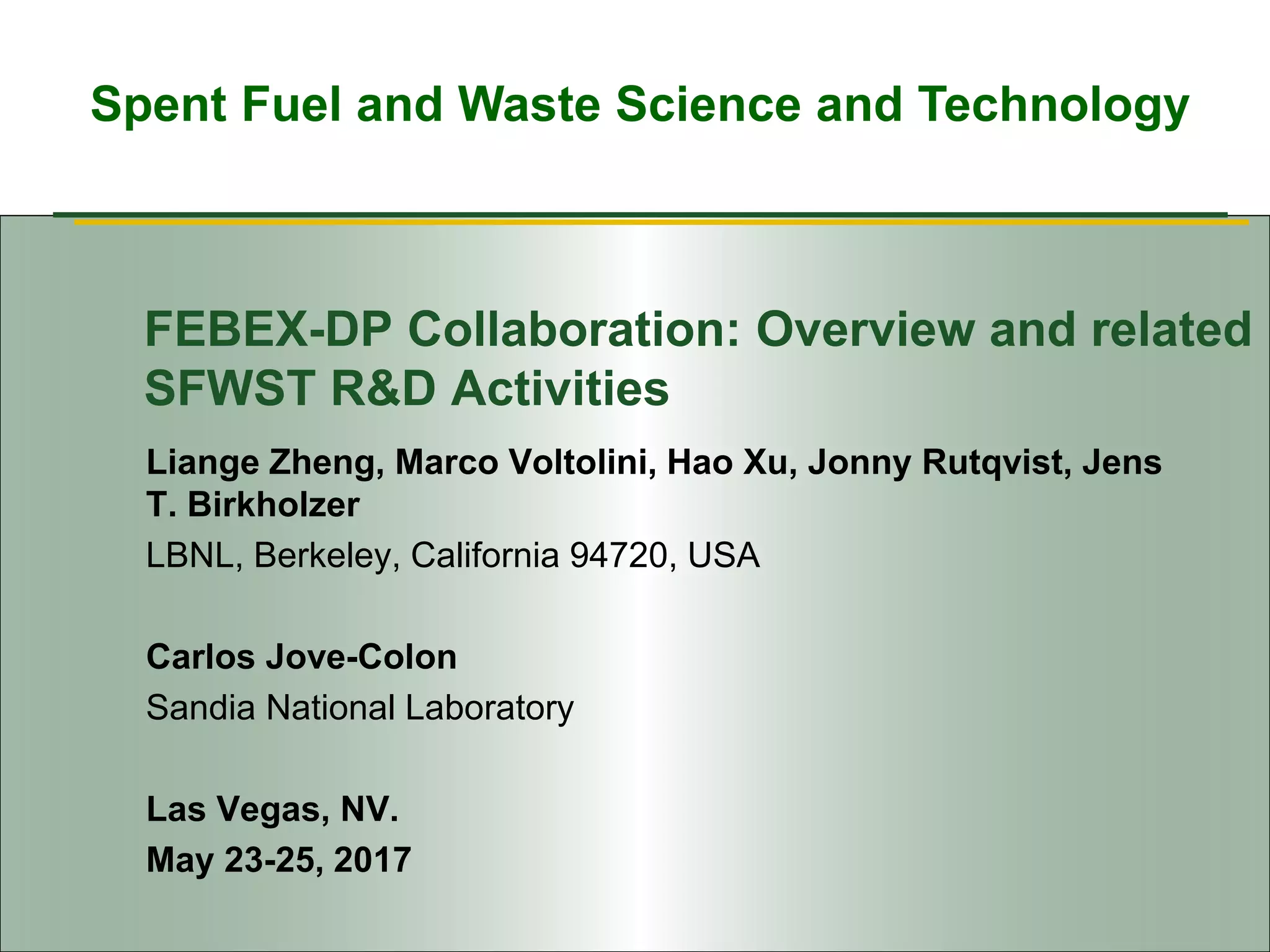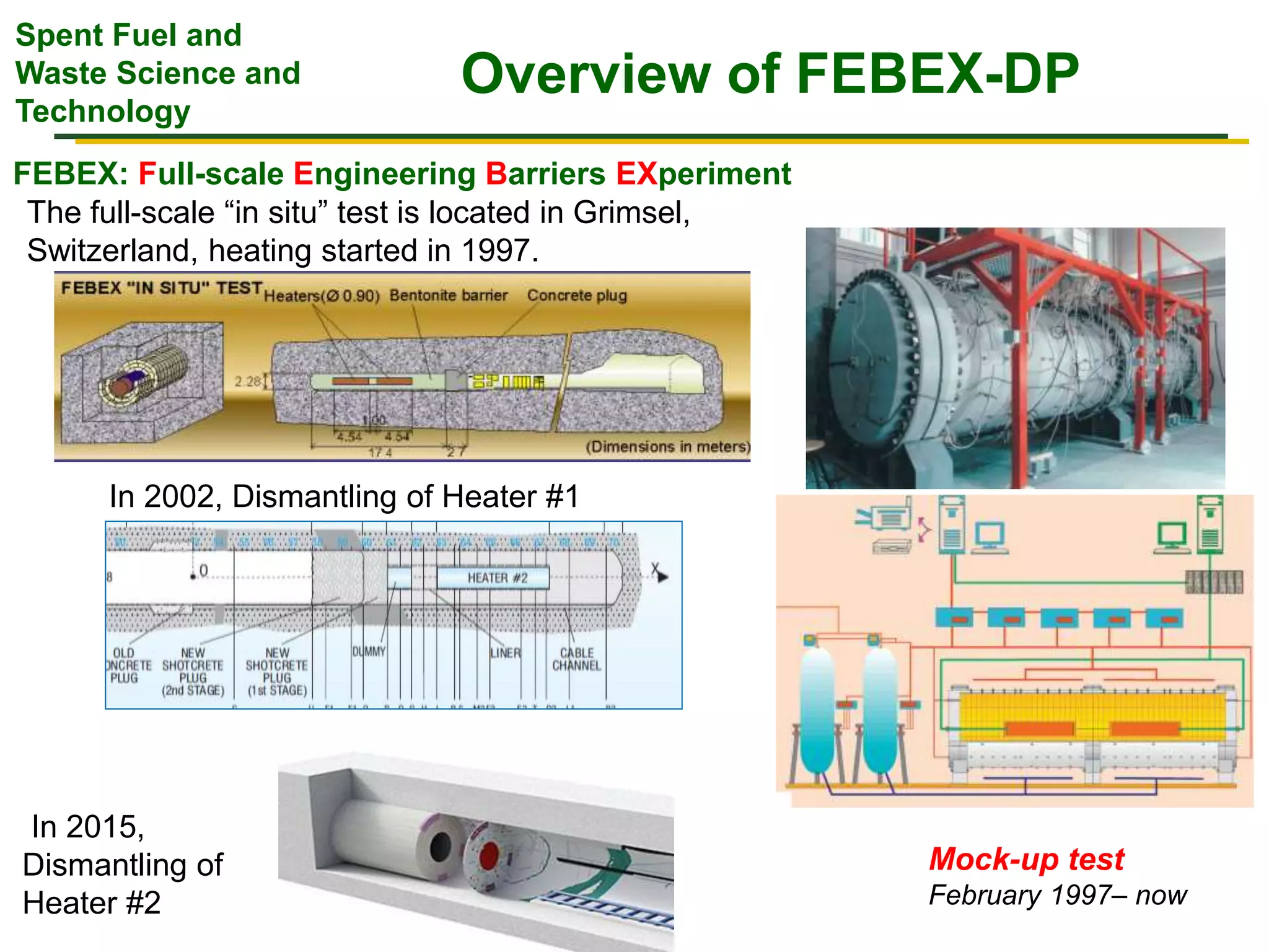 The document summarizes research from the FEBEX-DP collaboration studying the full-scale FEBEX bentonite experiment located in Grimsel, Switzerland. It discusses characterization of the bentonite following dismantling of heater #2, including changes to density, water content, mineralogy, and pore water chemistry. THM and THMC models were developed and validated against experimental data to analyze thermal-hydrological-mechanical and chemical processes. Microstructural analysis using synchrotron X-ray microCT provided 3D characterization of the bentonite microstructure. Further work is focused on refining chemical models, analyzing gas evolution and microbial activity, and characterizing the bentonite-concrete interface.