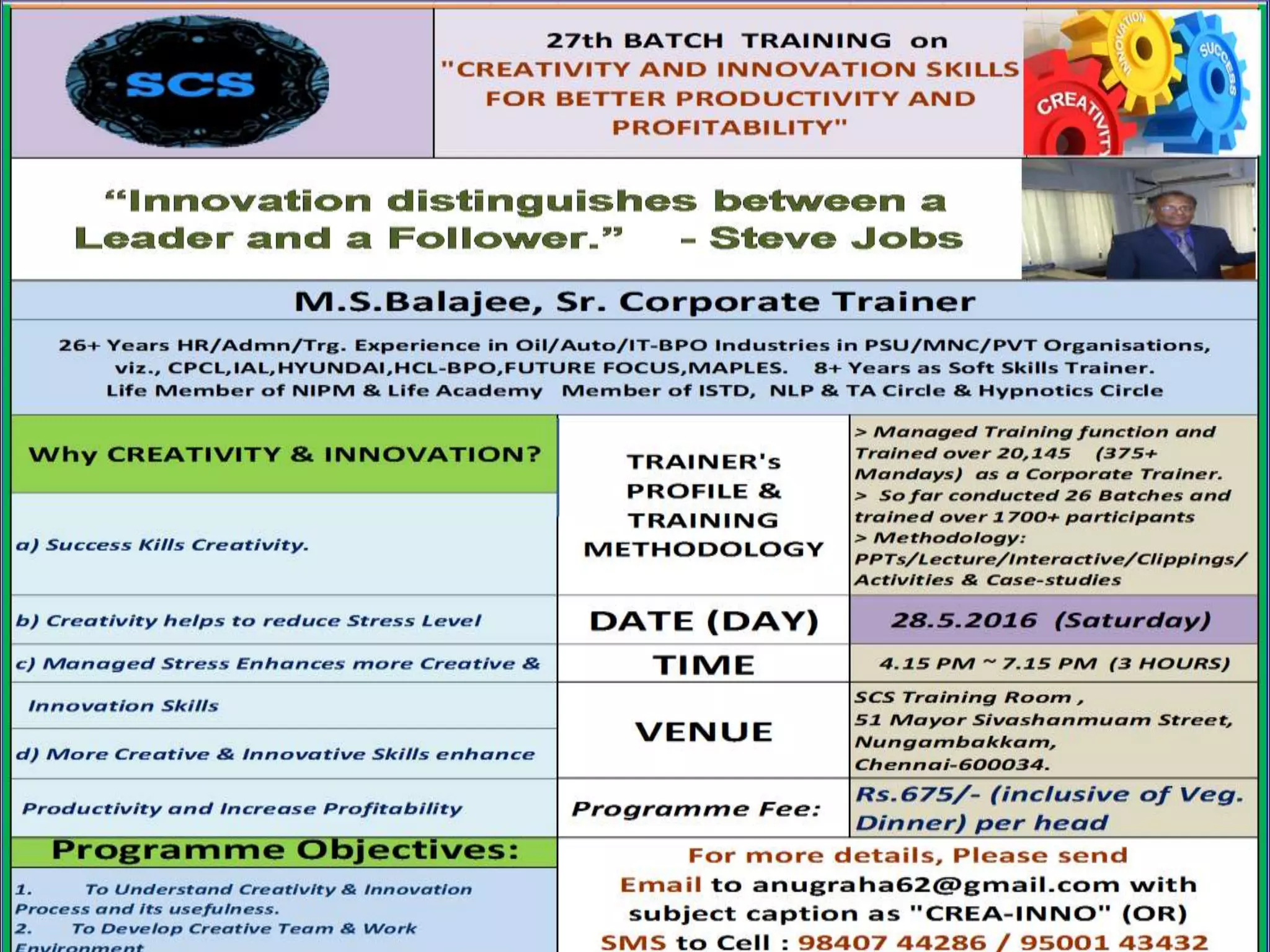 OUR NEXT PROGRAMME SCHEDULED ON (1) CREATIVITY & INNOVATION SKILLS PROGRAMME - 28TH MAY 2016 - 3 Hours 4.15 PM go 7.15 PM - Brochure attached. Kindly go through the above TWO Programmes and nominate your executives to enhance their Leadership, Creativity & Innovation Skills and ACHIEVE Higher Productivity & Profitability. Please do not hesitate to call us for any further queries/clarification.