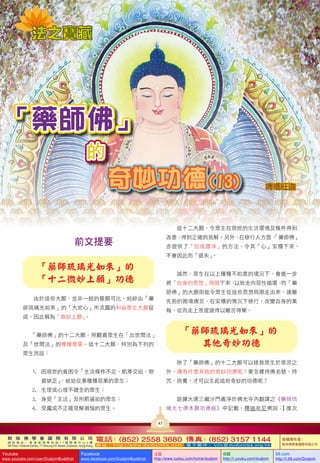 文档介绍了「药师琉璃光如来」的十二大愿,这些愿望旨在帮助受苦众生改善生活条件,并提供心灵的安宁。在面对种种艰难困境时,这些愿望能使众生超越痛苦,走向正道。此外,提到唤起对如来名号的信念,可以帮助众生在来世中脱离恶道,获得更好的投生。