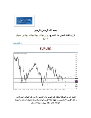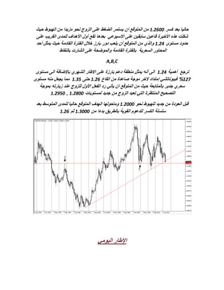 تشير الرؤية الفنية لهذا الأسبوع إلى استمرار الضغوط السلبية على أزواج اليورو دولار والباوند دولار مما قد يؤدي إلى مزيد من الانخفاض نحو مستويات دعم رئيسية تشمل 1.26 و111.26. كما تظهر الأوضاع المتقلبة على زوج الدولار كندي اتجاهًا صعوديًا مؤقتًا مع التركيز على صفقات الشراء من مستويات محددة، بينما يتوقع للباوند ين استمرارية النزول نحو أهداف دنيا. تستمر المعاملات على الأزواج المختلفة في الاعتماد على نقاط الدعم والمقاومة المحددة لضمان استراتيجية تداول واضحة.