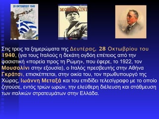 Στις τρεις ταξημερώματα της Δευτέρας, 28 Οκτωβρίου του 1940 , ( για τους Ιταλούς η δεκάτη ογδόη επέτειος από την φασιστική «πορεία προς τη Ρώμη», που έφερε, το 1922, τον Μουσολίνι στην εξουσία ), ο Ιταλός πρεσβευτής στην Αθήνα Γκράτσι , επισκέπτεται, στην οικία του, τον πρωθυπουργό της Χώρας, Ιωάννη Μεταξά και του επιδίδει τελεσίγραφο με το οποίο ζητούσε, εντός τριών ωρών, την ελεύθερη διέλευση και στάθμευση των ιταλικών στρατευμάτων στην Ελλάδα.