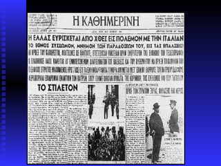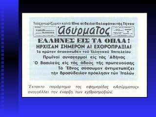 "Αι ιταλικαί στρατιωτικαίδυνάμεις προσβάλλουσιν από της 05:30 ώρας της σήμερον τα ημέτερα τμήματα προκαλύψεως της Ελληνοαλβανικής Μεθορίου. Αι ημέτεραι δυνάμεις αμύνονται του Πατρίου εδάφους." 28η Οκτωβρίου 1940