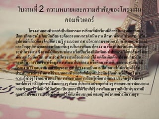 ใบงานที่ 2 ความหมายและความสาคัญของโครงงาน คอมพิวเตอร์ โครงงานคอมพิวเตอร์เป็นกิจกรรมการเรียนที่นักเรียนมีอิสระในการเลือกศึกษา ปัญหาที่ตนสนใจ