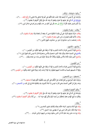 متشابهات 2 *(ُُّوهادر–ُاهنْددرف-ُّكادرل: ) (زْحت َلو يِافخت َلو ِّمْيلا يِف ِيهِْقلأف ِهْيلع ِتْفِخ اذِإف ِيهِعِضْرأ ْنأ ىوسُم ُِّمأ ىلِإ انْيحْوأواَّنِإ يِنُُّوهادرِكْيلِإ...(٧)). (ُاهنْددرفِهُِّمأ ىلِإونُملْعي َل ْمُهرثْكأ َّنِكلو ٌّقح ِهَّلال دْعو َّنأ ملْعتِلو نزْحت َلو اهُنْيع َّرقت ْيك(٣٣)). (آنْرُقْلا كْيلع ضرف يِذَّلا َّنِإُّكادرلٍادعم ىلِإم ُملْعأ يِّبَّر لُقٍنيِبُّم ٍلَلض يِف وُه ْنمو ىدُْهلاِب اءج ن(٥٢)). *(تالقو-ونُرُعْشي َل ْمُهو: ) (ِتالقواًدلو ُهذَِّختن ْوأ انعنفي نأ ىسع ُوهُلُتْقت َل كلو يِّل ٍنْيع ُتَّرُق نْوعْرِف ُتأرْامونُرُعْشي َل ْمُهو(٩)). (قوْتالٍبُنُج نع ِهِب ْترُصبف ِيهِّصُق ِهِتْخُِْلونُرُعْشي َل ْمُهو(٣٣. )) (ْتالقُينِم ْاْل ُّيِوْقلا تْرْجأتْاس ِنم رْيخ َّنِإ ُهْرِْجأتْاس ِتبأ اي امُاهدْحِإ(٥٦. )) *(حبْصأو-حبْصأف: ) (حبْصأووسُم ُِّمأ ُادؤُفينِنِمْؤُْملا نِم ونُكتِل اهِْبلق ىلع اْنطبَّر نأ َلْول ِهِب يِدْبُتل ْتادكنِإ اًغِراف ى(٣١. )) (حبْصأفِوغل كَّنِإ ىوسُم ُهل الق ُهُخِرْصتْسي ِسْم ْاْلِب ُهرنصتْاس يِذَّلا اذِإف ُبَّقرتي اًفِائخ ِةينِدْملا يِفٌّيينِبُّم(٣٥. )) (حبْصأويو ِهِادبِع ْنِم اءشي نمِل قْزِّالر ُطُسْبي هَّلال َّنأكْيو ونُلوُقي ِسْم ْاْلِب ُهانكم اَّْونمت ينِذَّلاُرِدْق...(٥٥. )) *(ينِنِمْؤُْملا نِم: ) (ْتادكنِإ اًغِراف ىوسُم ُِّمأ ُادؤُف حبْصأواْنطبَّر نأ َلْول ِهِب يِدْبُتلونُكتِل اهِْبلق ىلعينِنِمْؤُْملا نِم(٣١. )) (ف ًوَلُسر انْيلِإ ْتلسْرأ َلْول انَّبر اوُلوُقيف ْمِهيِدْيأ ْتَّمدق امِب ةيبِصُّم مُهيبِصُت نأ َلْولوونُكنو كِاتآي عَِّبتنُْملا نِمينِنِمْؤ(٤٧. )) *(ونُحِاصن-ينِحَِّاصنال نِم: ) (ُهل ْمُهو ْمُكل ُهنوُلُفْكي ٍتْيب ِلْهأ ىلع ْمُكُّلُدأ ْله ْتالقف ُلْبق نِم عِاضرْملا ِهْيلع انْمَّرحوونُحِاصن(٣٥. )) (ق ىعْسي ِةينِدْملا ىْصقأ ْنِّم لُجر اءجوكل ِّينِإ ْجُرْخاف وكُلُتْقيِل كِب ونُرِمْتأي َلْملا َّنِإ ىوسُم اي الينِحَِّاصنال نِم(٥١. )) *(ونُملْعي َل ْمُهرثْكأ َّنِكلو: ) (َّلال دْعو َّنأ ملْعتِلو نزْحت َلو اهُنْيع َّرقت ْيكِهُِّمأ ىلِإ ُاهنْددرفٌّقح ِهونُملْعي َل ْمُهرثْكأ َّنِكلو(٣٣. )) (اًنِآم اًمرح ْمُهَّل نِّكمُن ْملوأ انِضْرأ ْنِم ْفَّطختُن كعم ىدُْهلا ِعَِّبتَّن نِإ واُلاقو...اَّنُدَّل نِمَّنِكلوونُملْعي َل ْمُهرثْكأ(٢٧. )) *(اَّملو: ) (َّملوايِزْجن كِلذكو اًْملِعو اًْمكُح ُاهنْيآت ىوتْاسو َُّهدُشأ غلبينِنِسْحُْملا(٣٤. )) (اَّملوِيلِبَّالس اءوس يِنيِدْهي نأ يِّبر ىسع الق نيْدم اءْقلِت هَّجوت(٥٥. )) (اَّملوِّم ًةَُّمأ ِهْيلع دجو نيْدم اءم دروِانودُذت ِنْيأترْام ُمِهِونُد نِم دجوو ونُقْسي َِّاسنال ن...(٥٣. ))