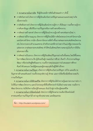 ๆ ดังนี้ การคิดวิเคราะห์ เกิดจากการที่ผู้เรียนต้องวิเคราะห์ปัญหาและแยกแยะสาเหตุว่าเกิด เนื่องจากอะไร การคิดสังเคราะห์ เกิดจากการที่ผู้เรียนต้องนาความรู้ต่าง ๆ ที่เรียนมา รวมทั้งความรู้จาก การค้นหาข้อมูล เพื่อใช้ในการแก้ปัญหาหรือการสร้างสรรค์โครงงาน การคิดอย่างสร้างสรรค์ เกิดจากการที่ผู้เรียนนาความรู้มาสร้างสรรค์ผลงานใหม่ ๆ การคิดอย่างมีวิจารณญาณ เกิดจากการที่ผู้เรียนได้มีการคิดไตร่ตรองว่าควรทาโครงงานใด และไม่ควรทาโครง งานใด เนื่องจากโครงงานที่สร้างขึ้นอาจส่งผลกระทบต่อสังคมโดยรวม เช่น โครงงานระบบคานวณเลขหวย สาหรับหาเลขที่คาดว่าสลากกินแบ่งรัฐบาลจะออกใน แต่ละงวด อาจส่งผลกระทบต่อสังคม ทาให้คนในสังคมเกิดความหมกมุ่นในกับการใช้เงิน เล่นหวยมากขึ้น การคิดอย่างเป็นระบบ เกิดจากการที่ผู้เรียนคิดแก้ปัญหาอย่างเป็นขั้นตอน โดยใช้ขั้นตอน ในการพัฒนาโครงงาน คือ ผู้เรียนเป็นผู้วางแผนในการศึกษา ค้นคว้า เก็บรวบรวมข้อมูล พัฒนา หรือประดิษฐ์คิดค้นผลงาน รวมทั้งการสรุปผลและการนาเสนอผลการศึกษา ค้นคว้าด้วยตนเอง โดยมีผู้สอนและผู้ทรงคุณวุฒิเป็นผู้ให้คาปรึกษา 3. ความสามารถในการแก้ปัญหา เกิดจากการที่ผู้เรียนวิเคราะห์ปัญหา เข้าใจ และอธิบาย ปัญหาทางด้านคอมพิวเตอร์ รวมทั้งประยุกต์ความรู้ ทักษะ และการใช้เครื่องมือที่เหมาะสมกับ การแก้ไขปัญหา 4. ความสามารถในการใช้ทักษะชีวิต เกิดจากการที่ผู้เรียนได้นาความรู้และกระบวนการต่าง ๆ ไปใช้ในการพัฒนาโครงงาน และนาไปประยุกต์ใช้ในชีวิตประจาวันได้อย่างเหมาะสม รวมถึงการ พัฒนาโครงงาน ก่อให้เกิดการเรียนรู้ด้วยตนเอง อันนาไปสู่การเรียนรู้ตลอดชีวิต 5. ความสามารถในการใช้เทคโนโลยี เกิดจากการที่ผู้เรียนสามารถเลือกใช้เทคโนโลยี สารสนเทศในการแก้ปัญหาได้ อย่างถูกต้องเหมาะสม และมีคุณธรรม ที่มา : http://krudarin.wordpress.com/