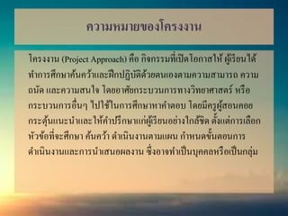 โครงงาน (ProjectApproach) คือ กิจกรรมที่เปิดโอกาสให้ ผู้เรียนได้