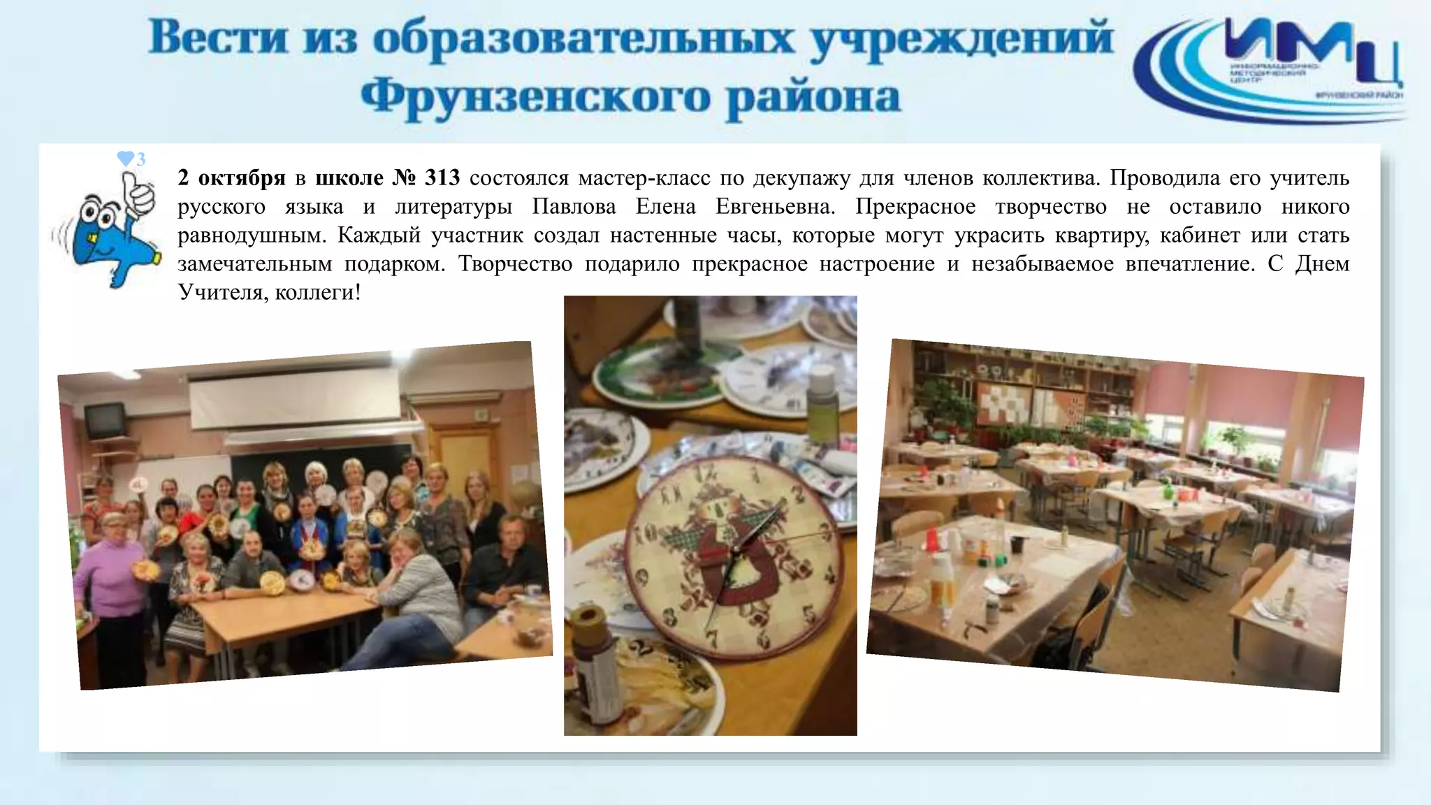В октябре в образовательных учреждениях фрунзенского района прошло множество мероприятий, включая мастер-классы, субботники, открытые занятия и спортивные соревнования. Учителя и учащиеся активно участвовали в культурных и педагогических событиях, таких как награждение победителей конкурсов и экскурсии. Данные мероприятия способствовали развитию творческих и социальных навыков у детей, создавая положительную атмосферу в учебных заведениях.