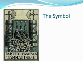 The document summarizes the rise and fall of the Fascist Party in San Marino from 1923 to 1943. The Fascist Party, led by Giuliano Gozi, came to power in 1923 after using violence against opponents like socialists. For 20 years, only Fascists could hold the position of Captain-Regent. However, independent politicians still controlled the parliament. After Mussolini's arrest in 1943, a large anti-fascist rally ended Fascist rule in San Marino, and July 28th became a national holiday commemorating liberation from fascism.